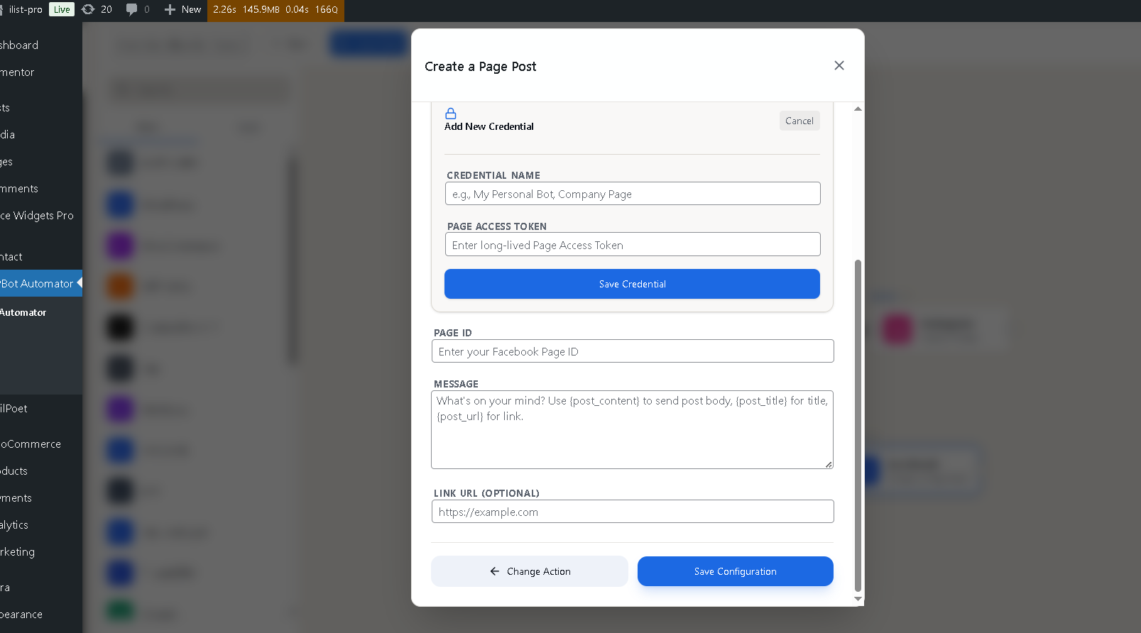 Click to set your access token and page id from facebook action.