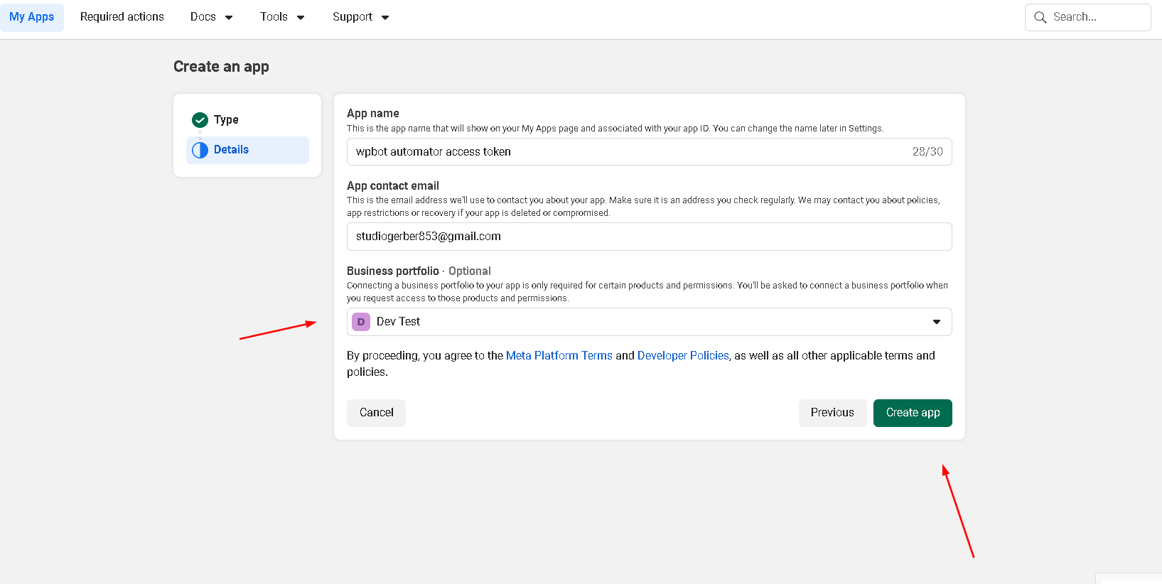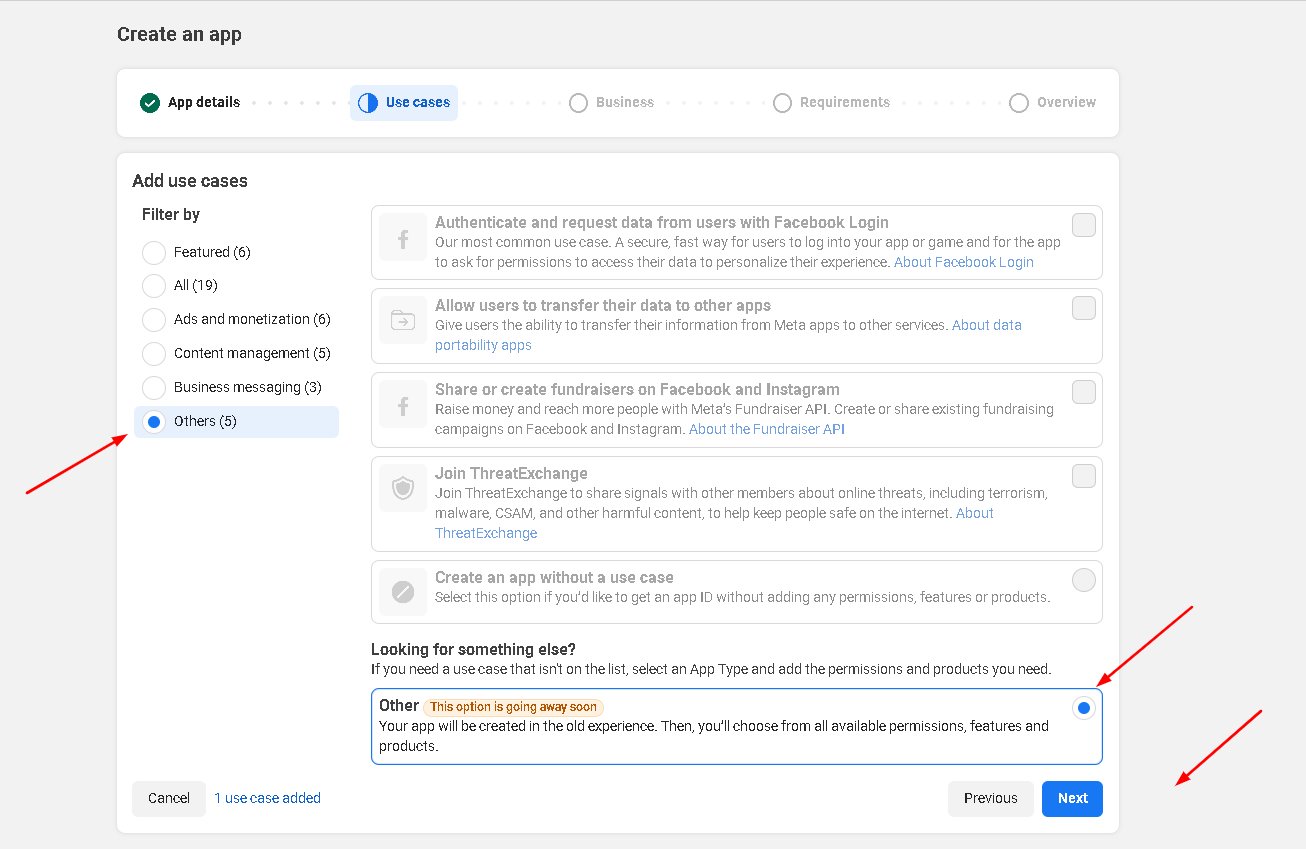 Choose Meta App and Page from selection option and choose permissions for Events Groups Pages.