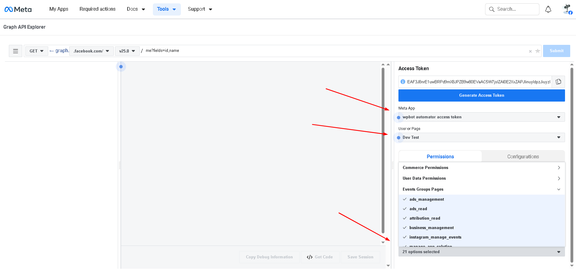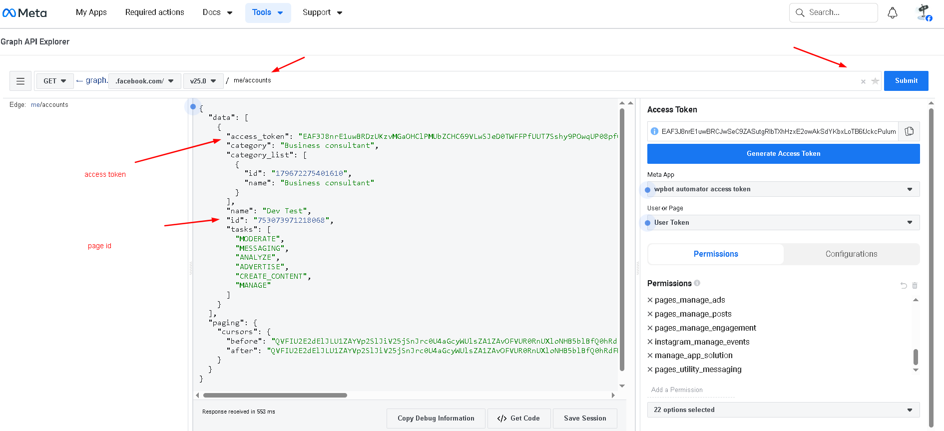 After creating permissions then choose user token from select option and add Graph url  me/accounts  and submit. Then show access token and page id.