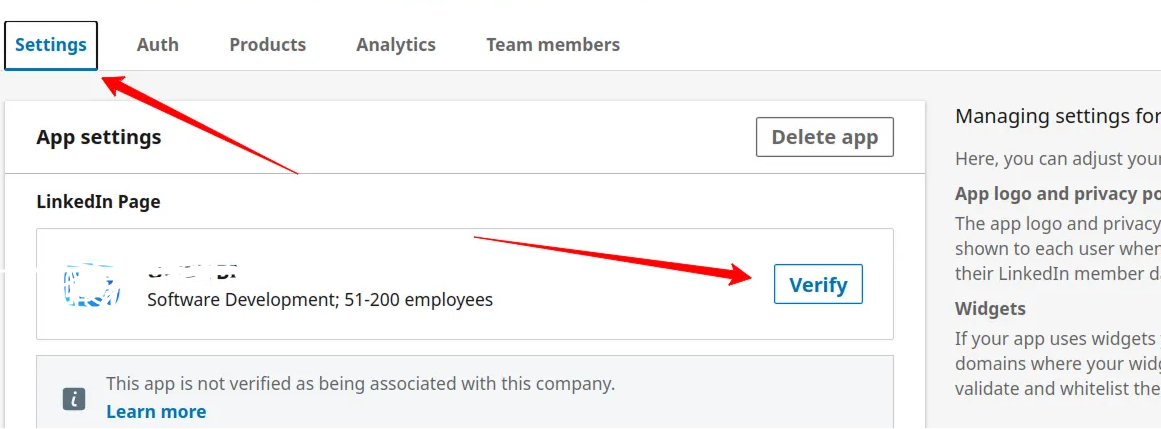 Go to the Settings tab and click the Verify button. Share the link with the administrator of your LinkedIn company page. The administrator must verify the app to grant it access to company data.Please ensure that the app is verified: