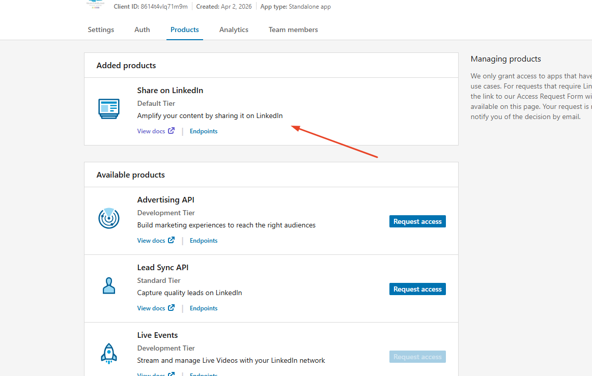 Once your app is verified, navigate to the Products tab and request access to the necessary APIs.
