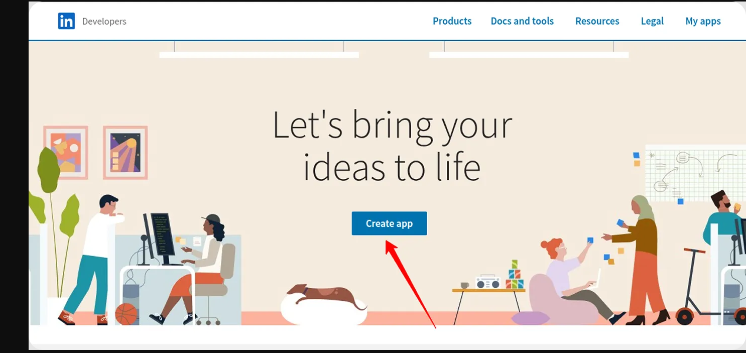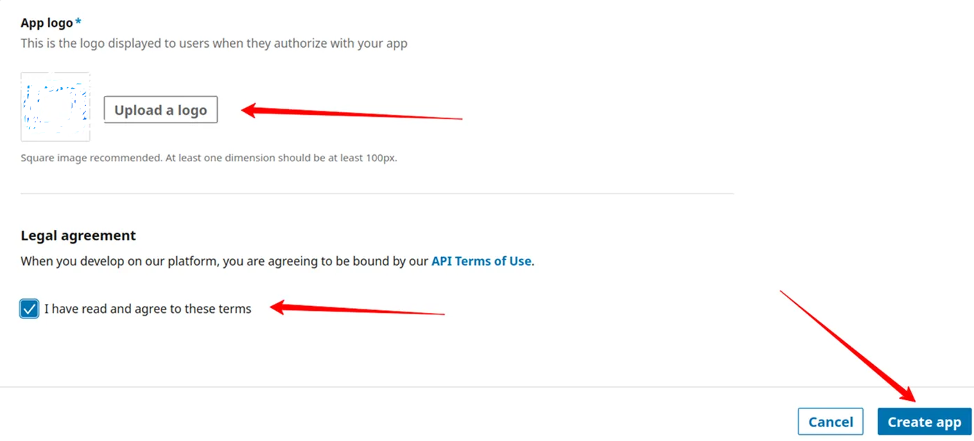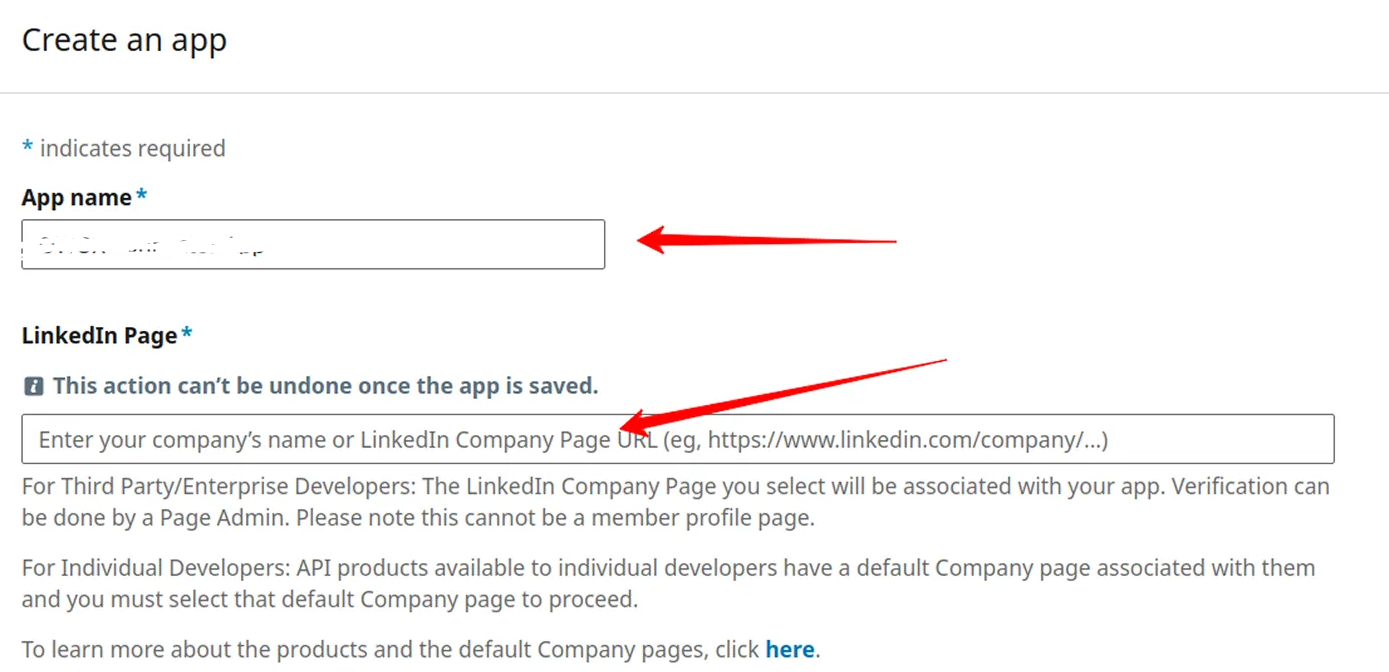 Visit the LinkedIn Developer portal ( https://developer.linkedin.com/ ).Click the Create App button.Enter your App Name and paste the link to your company’s LinkedIn page into the LinkedIn Page field.Upload your app logo, check the box to accept the legal agreement, and click the Create App button.