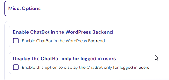- You can enable the WPBot ChatBot only for logged-in users from the General Settings->Misc. Options