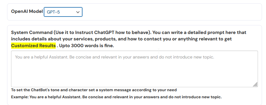 - Connect to an AI service like OpenAI and use the System Command to Instruct ChatGPT how to behave. You can write a detailed prompt here that includes details about your services, products, and how to contact you or anything relevant to get Customized Results . Upto 3000 words is fine.