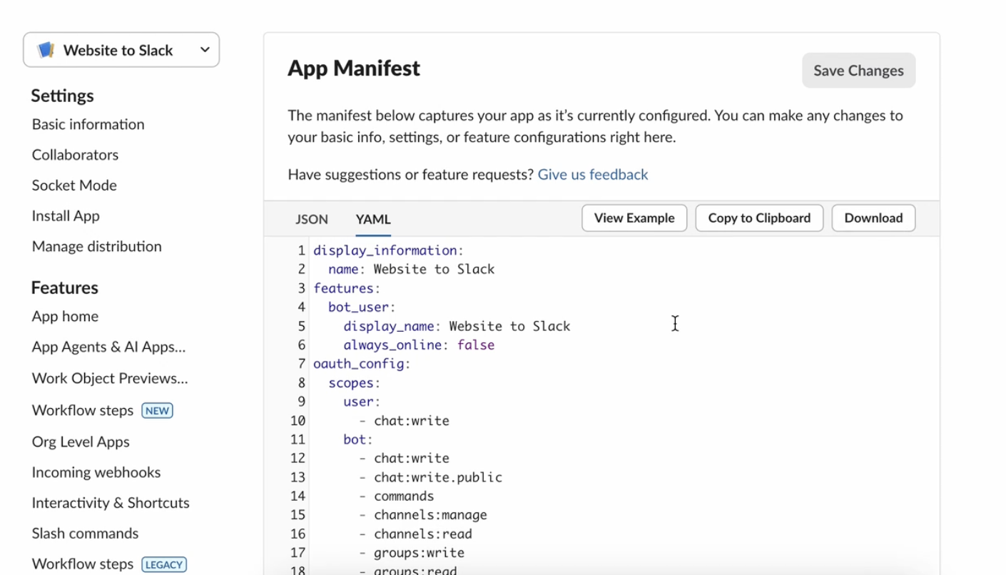 - Download the website_to_slack manifest file provided with your integration.