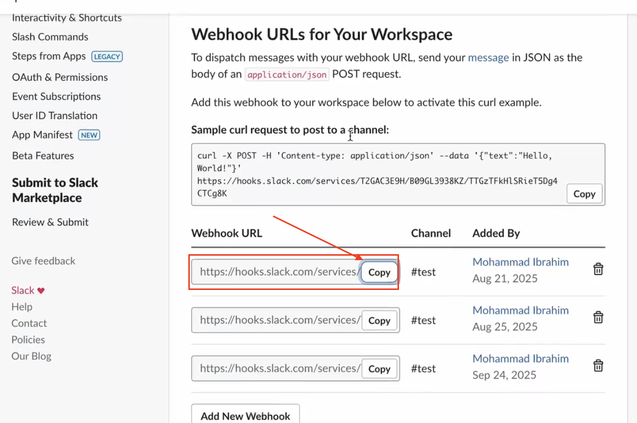 Then, add a new Webhook and copy the Webhook URL