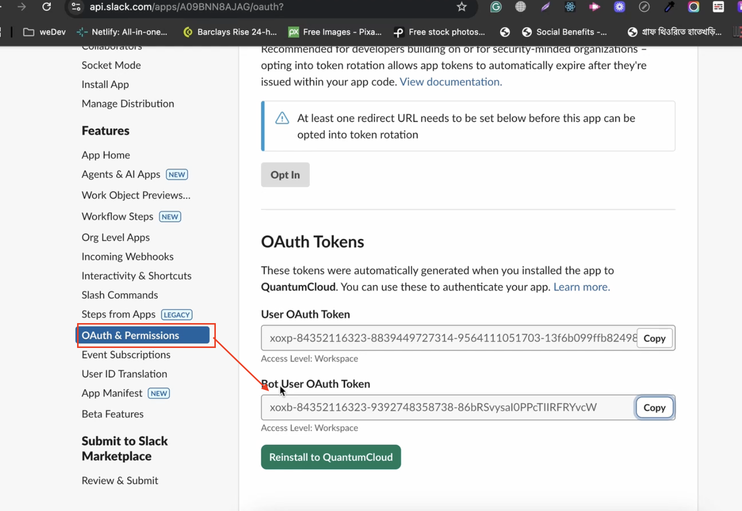 - From OAuth & Permissions after installing the app to your workspace.