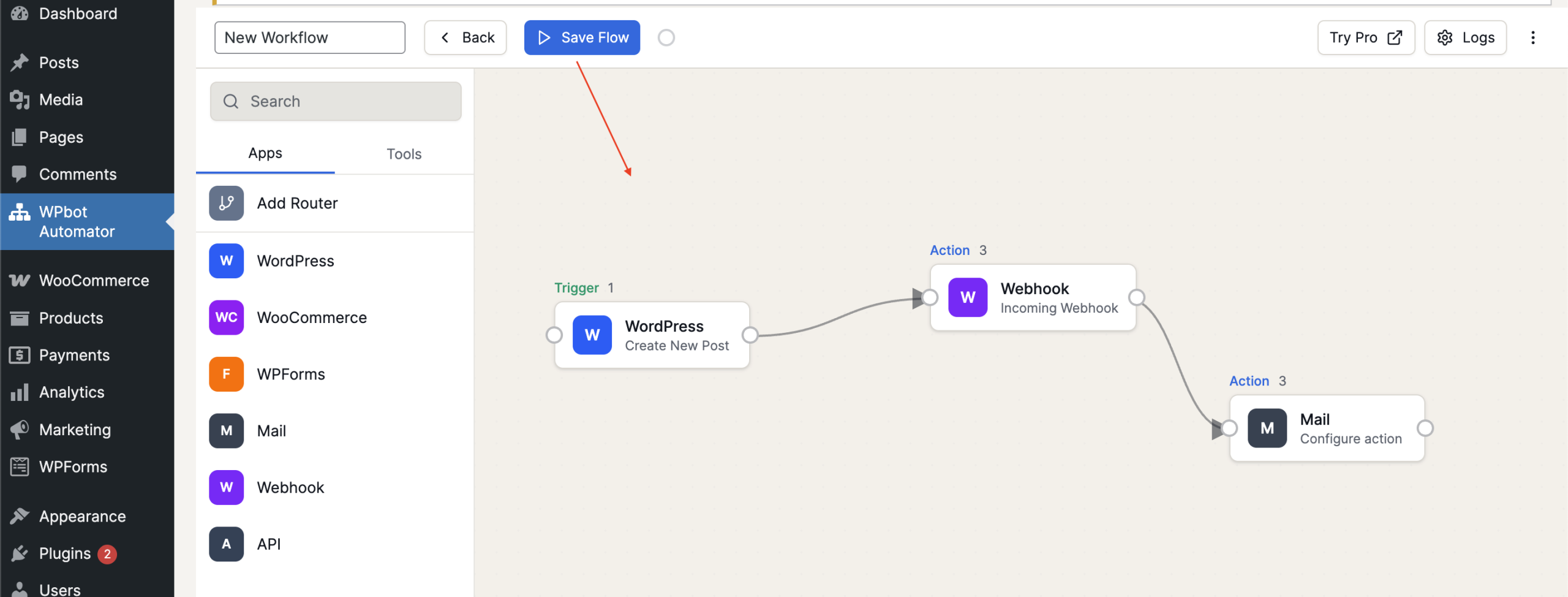 This plugin allows you to create automated workflows in WordPress using a visual no-code builder.